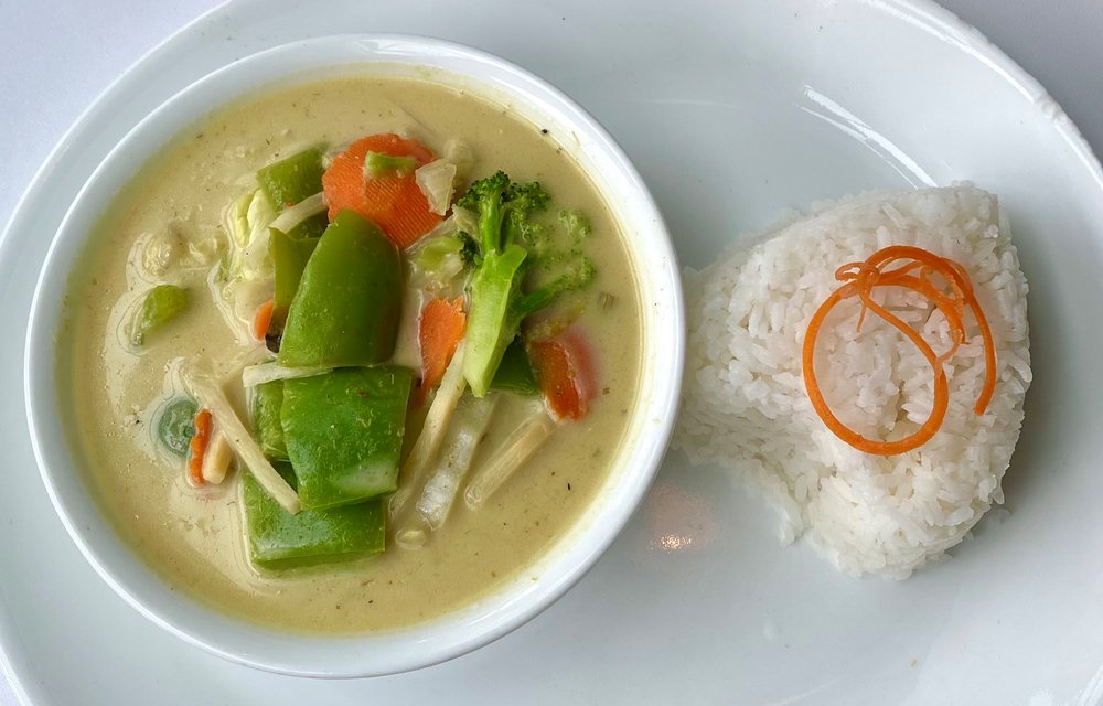 I got Green Curry with Chicken and it came with some soup and some sort of curried peanut sauce Im not entirely sure what the sauce. Thai Room Restaurant in Denver Tech Center CO.